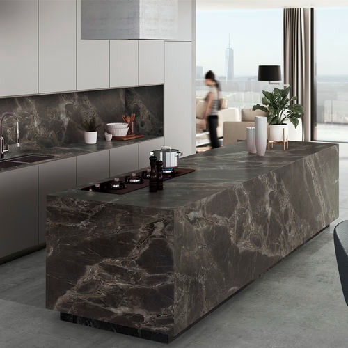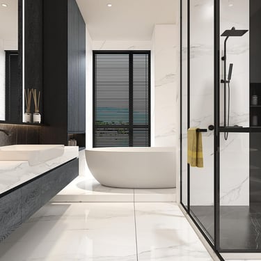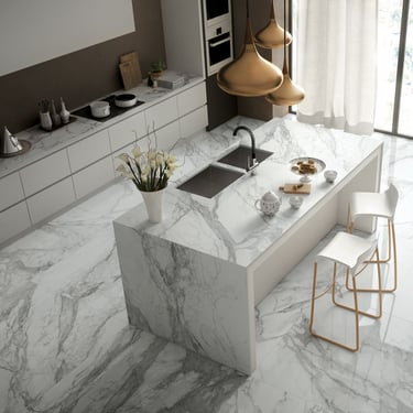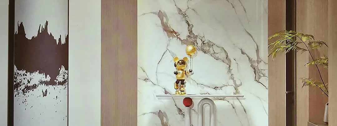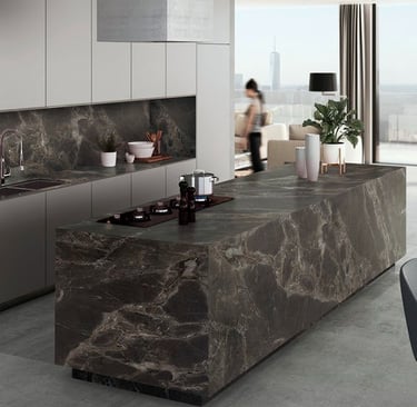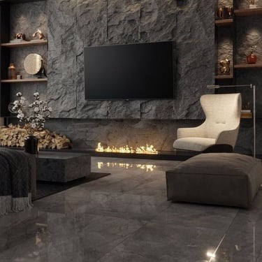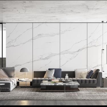 Sintered Stone Tiles: Large format tiles with continuous patterns and bookmatching.