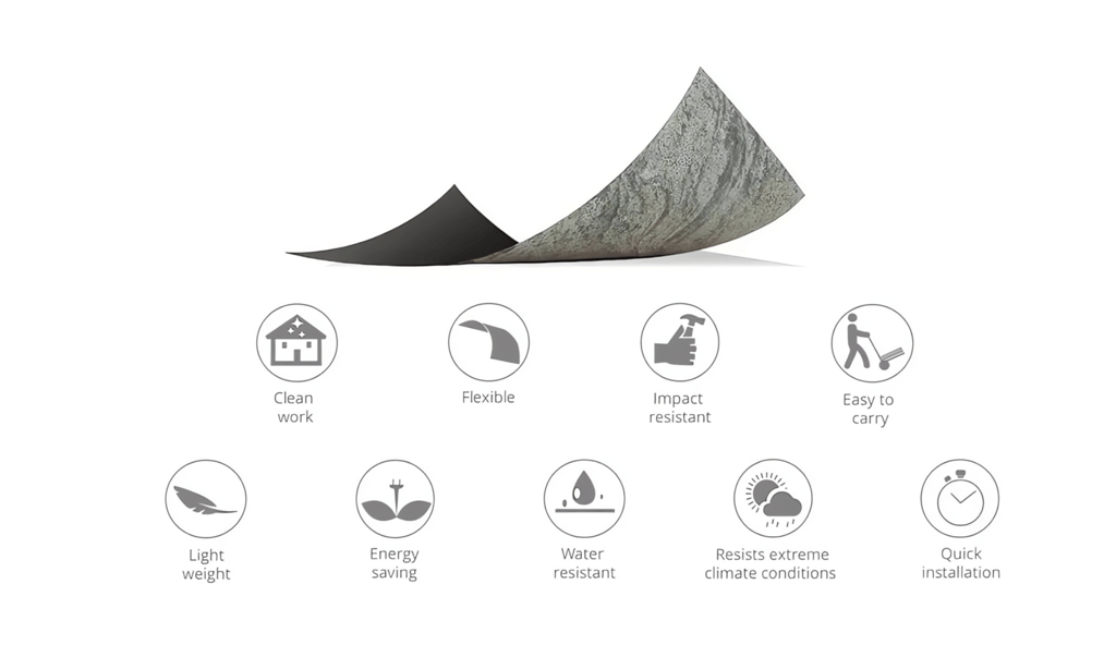 "Enjoy long-lasting beauty and durability with Soft Flexi Stone. Water-resistant and able to withstand extreme temperatures, it's ideal for both indoor and outdoor applications as well as for ceilings and walls"